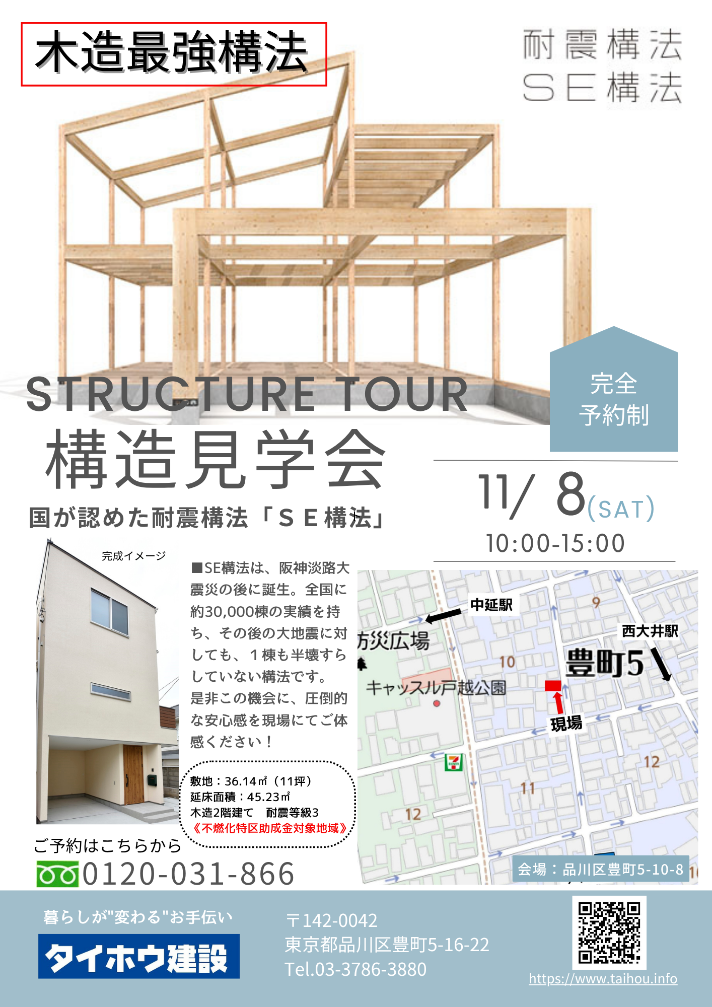 品川区豊町にて、耐震構法・SE構法の家の構造見学会を11月8日(土)10時~15時に開催いたします。