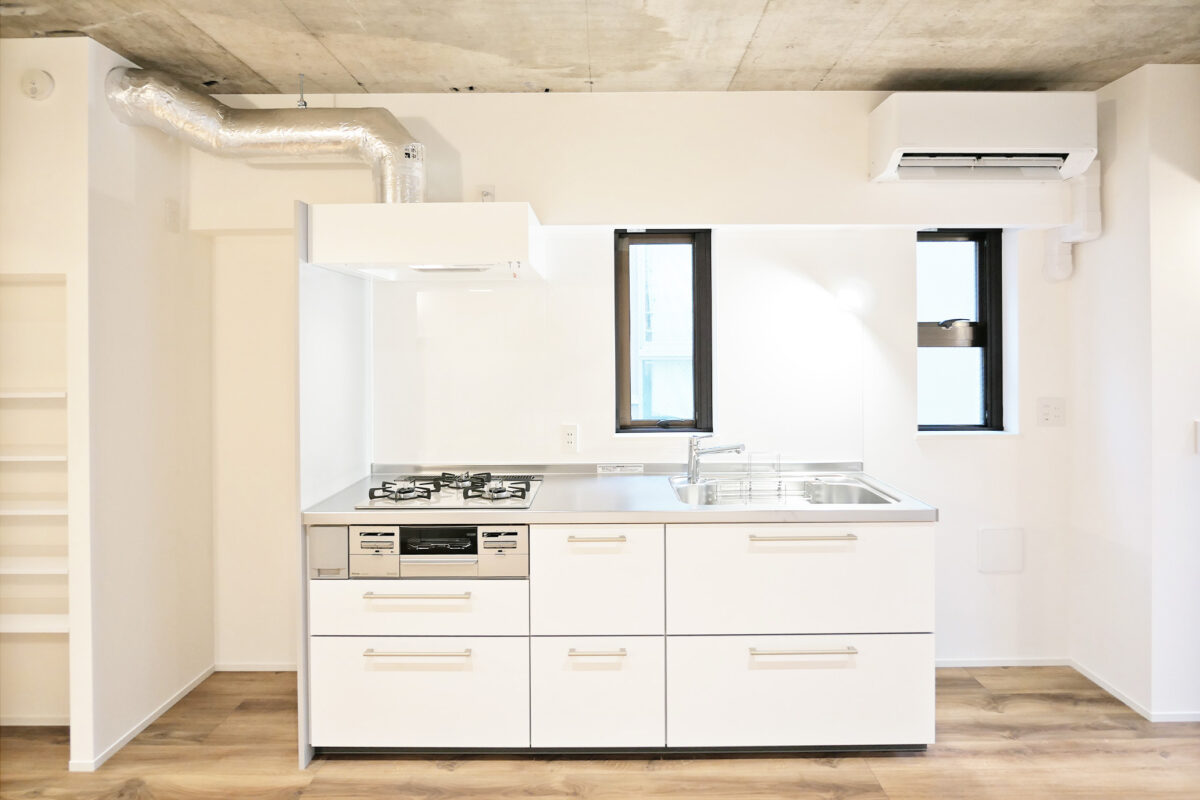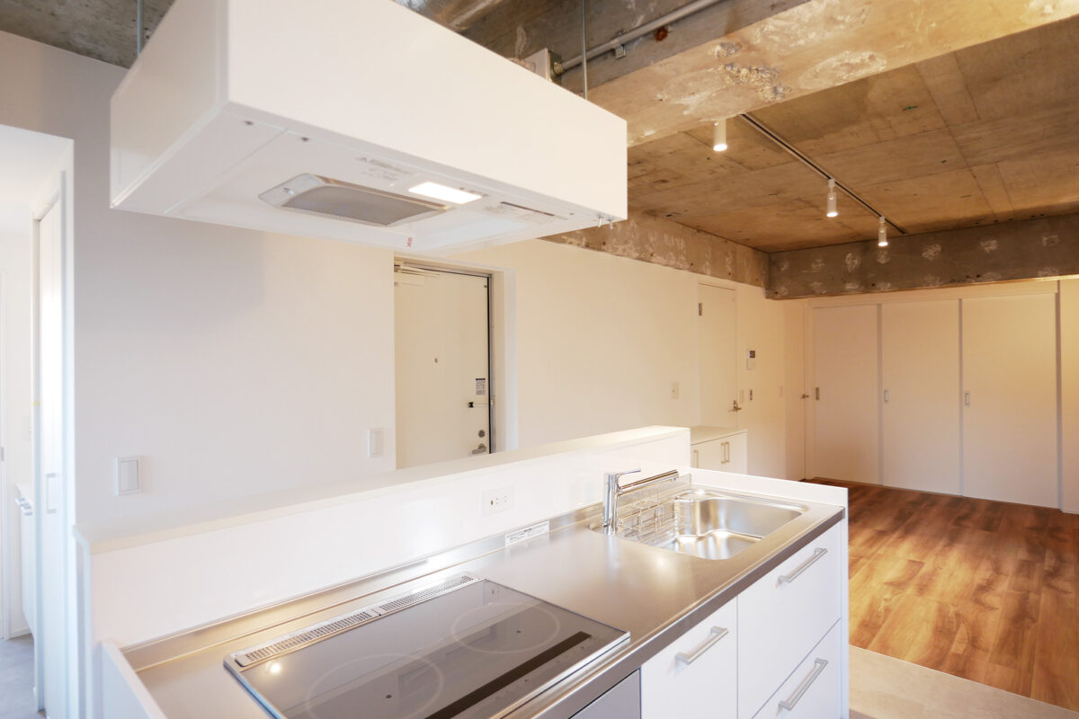 住戸内部はすべてクリーンな白で統一し、空間を広く明るく見せる設計をご提案しました。1・2階は既存コンクリート天井をあえて見せることで、無骨でスタイリッシュな開放感を演出する仕上げをご提案しました。最上階である3階は断熱性能を高めながら白い天井仕上げとし、高い階高を活かした開放感のある住戸をご提案しました。キッチンや水回りも空間に溶け込む白を採用し、シルバーのダクトレールと丸いフォルムの照明をアクセントに、シンプルな中に印象的なリズムを生む住戸デザインをご提案しました。