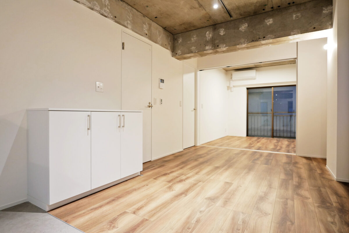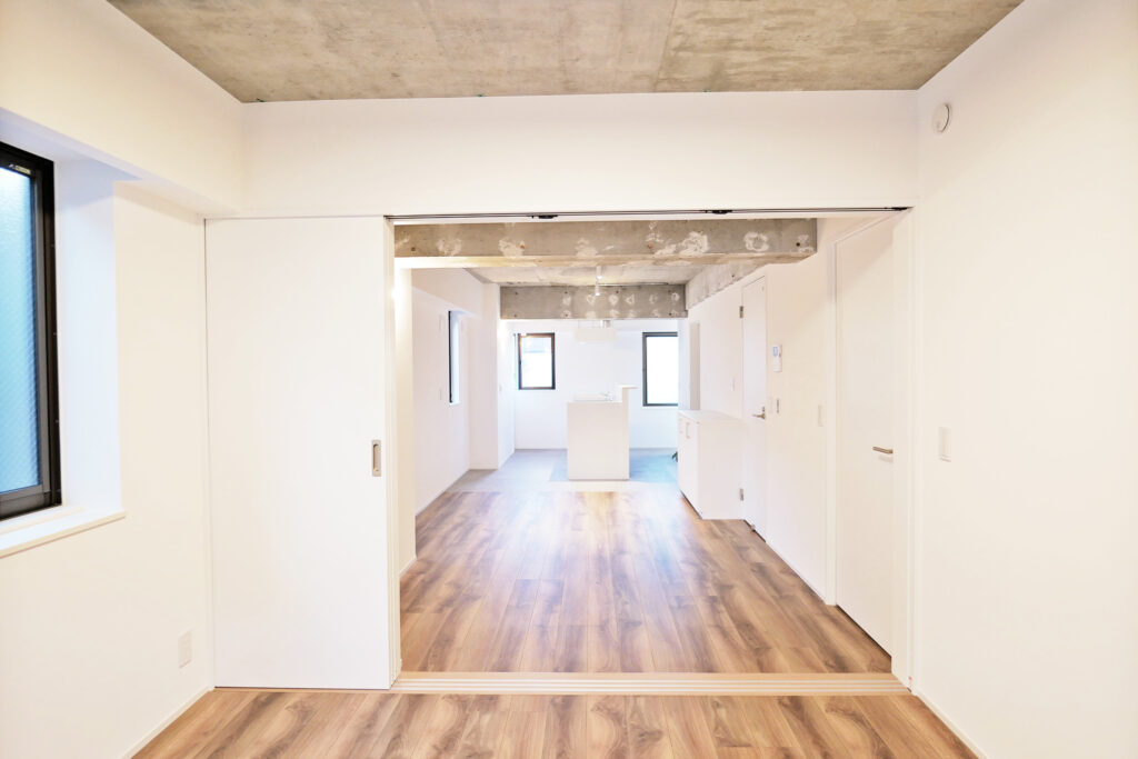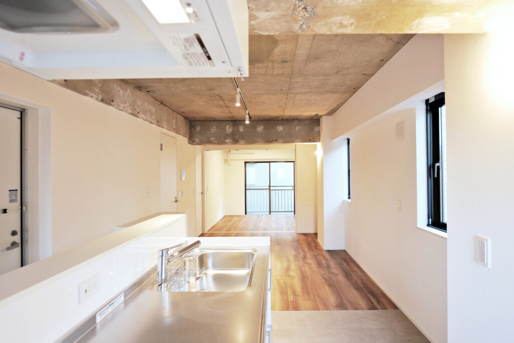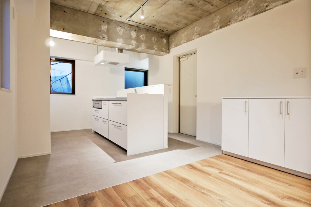 共用部や室内の一部には、解体時に現れたコンクリートの風合いを「味」として残し、新しい素材と組み合わせることで、新旧が融合したモダンな空間を創出。オーナー様のお住まいは、以前の家で気に入られていた開放感を大切に、光が隅々まで届く明るい居住空間へと再生しました。
