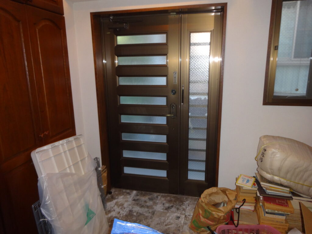 既存の外壁はそのまま活かしつつ、玄関ドア・中央の窓・シャッターを刷新しました。
